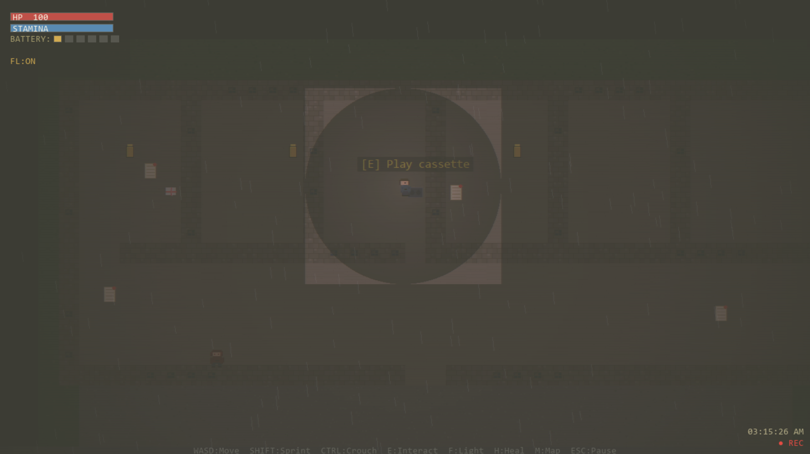 Experience a dynamic VHS atmosphere: scanlines, grain, chromatic aberration, and flickering lights.